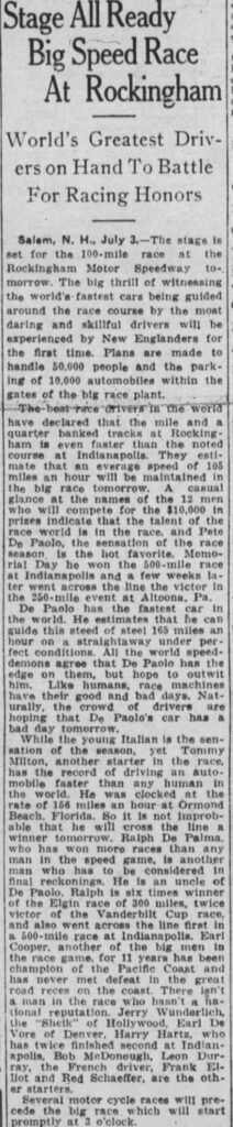 The July 4, 1925, race at Rockingham Motor Speedway in Salem, New Hampshire, was a 100-mile non-championship event sanctioned by the AAA and run on the venue’s original 1.25-mile dirt oval before the track was later converted to a high-banked wooden board surface for championship races. This Independence Day contest attracted a holiday crowd eager to see top drivers compete on the loose, dusty surface, which limited sustained speeds compared to the blistering board-track events that defined much of the 1925 AAA season.