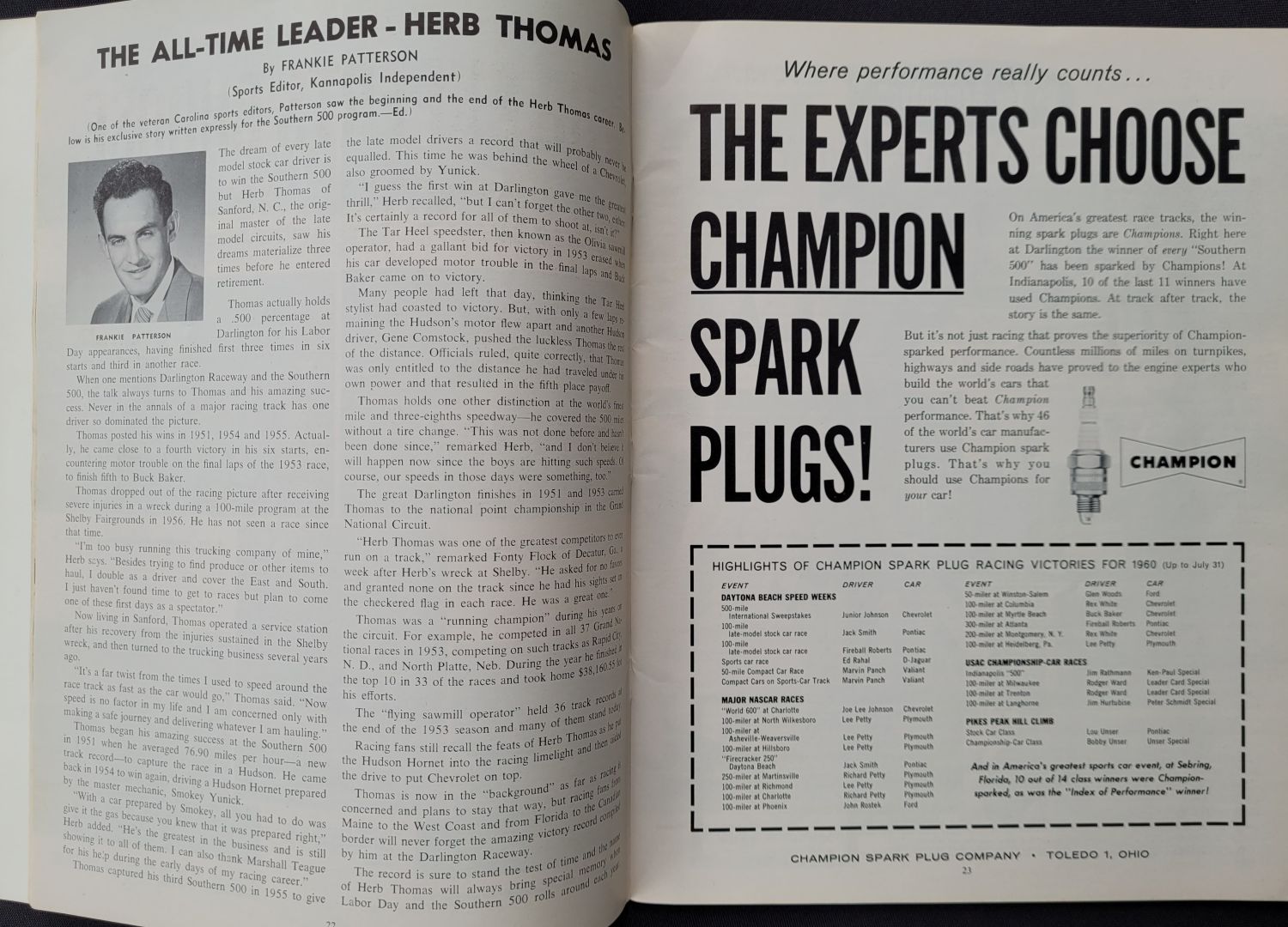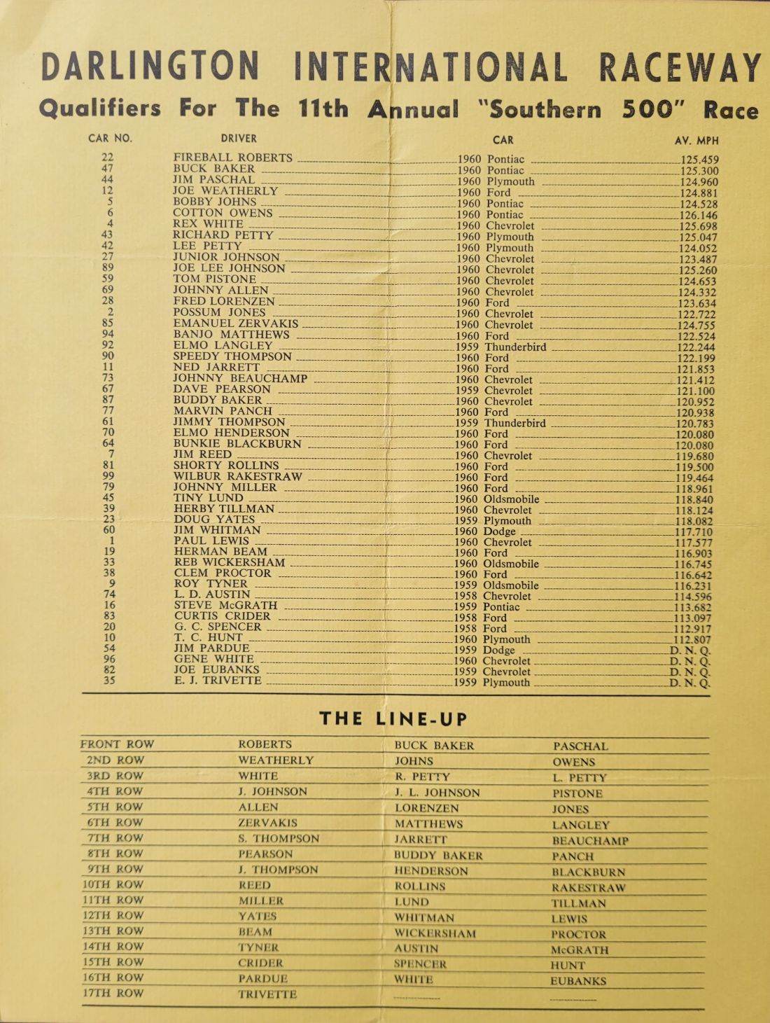 The 1960 Southern 500, held on September 5 at Darlington Raceway in South Carolina as the 35th race of the NASCAR Grand National Series, was a grueling 364-lap event on the 1.375-mile paved oval. The race lasted over four hours and 43 minutes with an average speed of 105.901 mph. Fireball Roberts captured the pole position in his Pontiac, but the race was dominated by Buck Baker, who started second, led a race-high 175 laps in his #47 Boomershine Pontiac, and claimed victory despite a dramatic right rear tire blowout on the final lap that forced him to limp across the finish line. Initially, Rex White was mistakenly announced as the winner due to a scoring error, but officials corrected it after reviewing scorecards, awarding Baker the $19,900 victory.